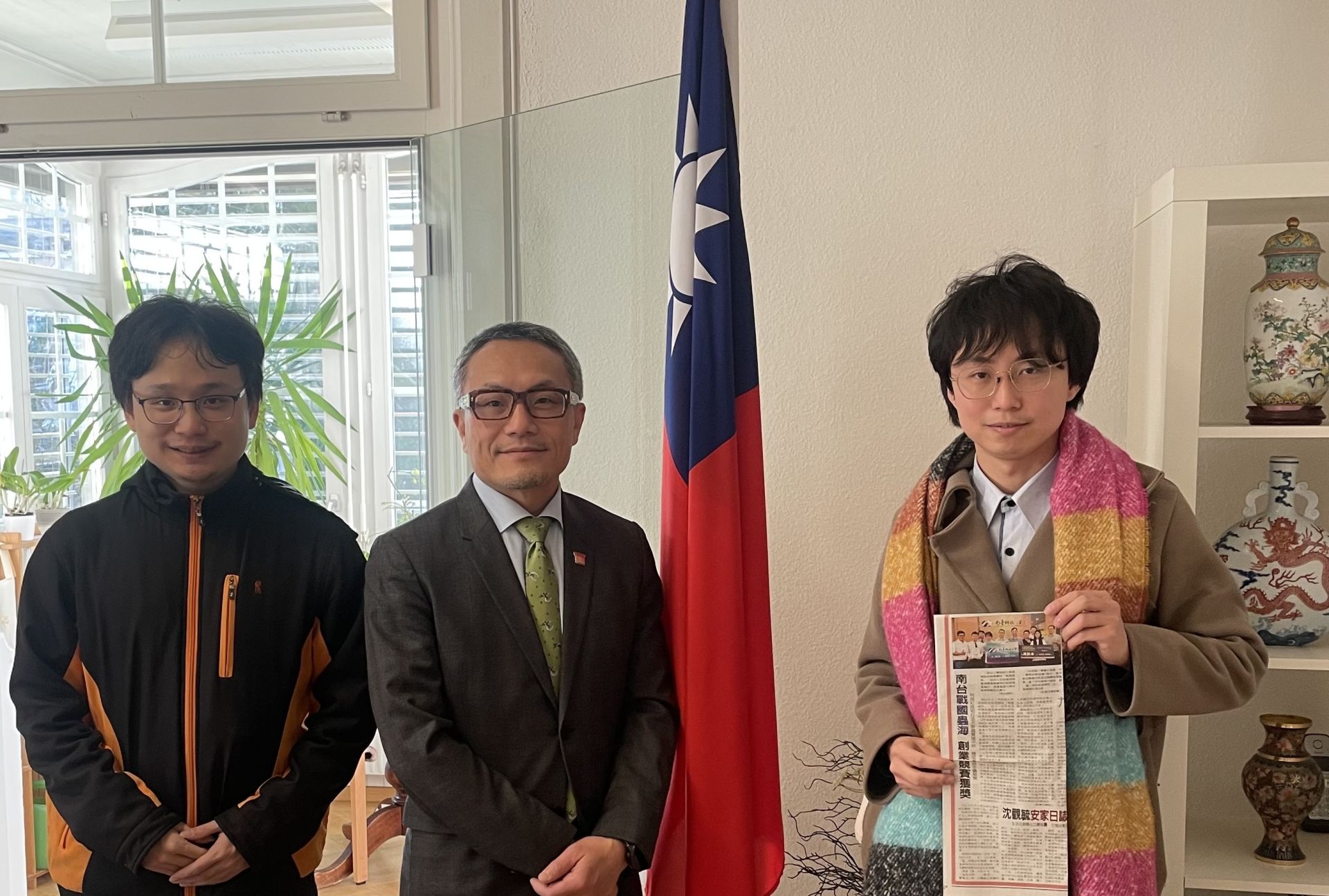 ▲林韋成及團隊成員林暐欽拜會中華民國駐瑞士臺北文化經濟代表團,與王思為駐外代表合照。(研考會 提供)