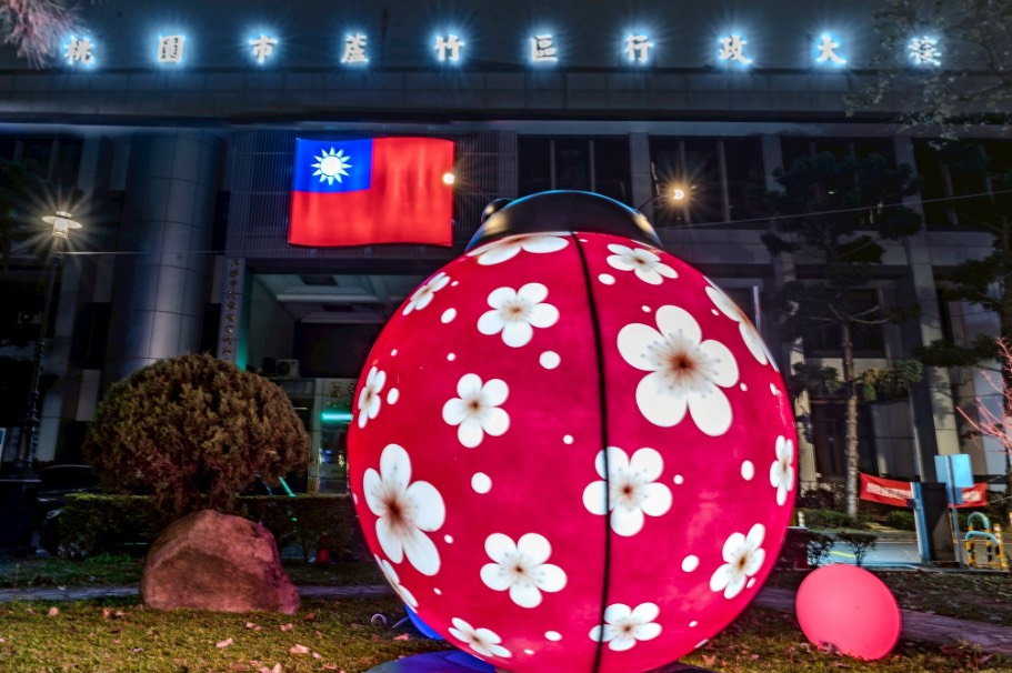 圖說:位於蘆竹區公所前的迎賓裝置「幸福瓢蟲」,以國花梅花與吉祥瓢蟲象徵幸福降臨,展現地方文化與國家精神的並存。(圖/蘆竹區公所提供)