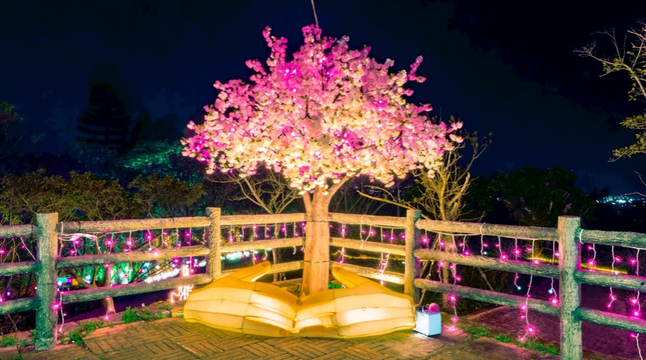 蘆竹的發展源自傳統農村,「農家水車」作品便以此為靈感,利用竹木結構與流瀑燈模擬灌溉循環,重現古老的水圳文化與農村智慧。而「春.日常」與「春花光亭」則將日常的泡茶、小動物與登山休憩場景藝術化,讓遊客在登高遠眺城市燈火的同時,體會「日常就是春天的詩」。