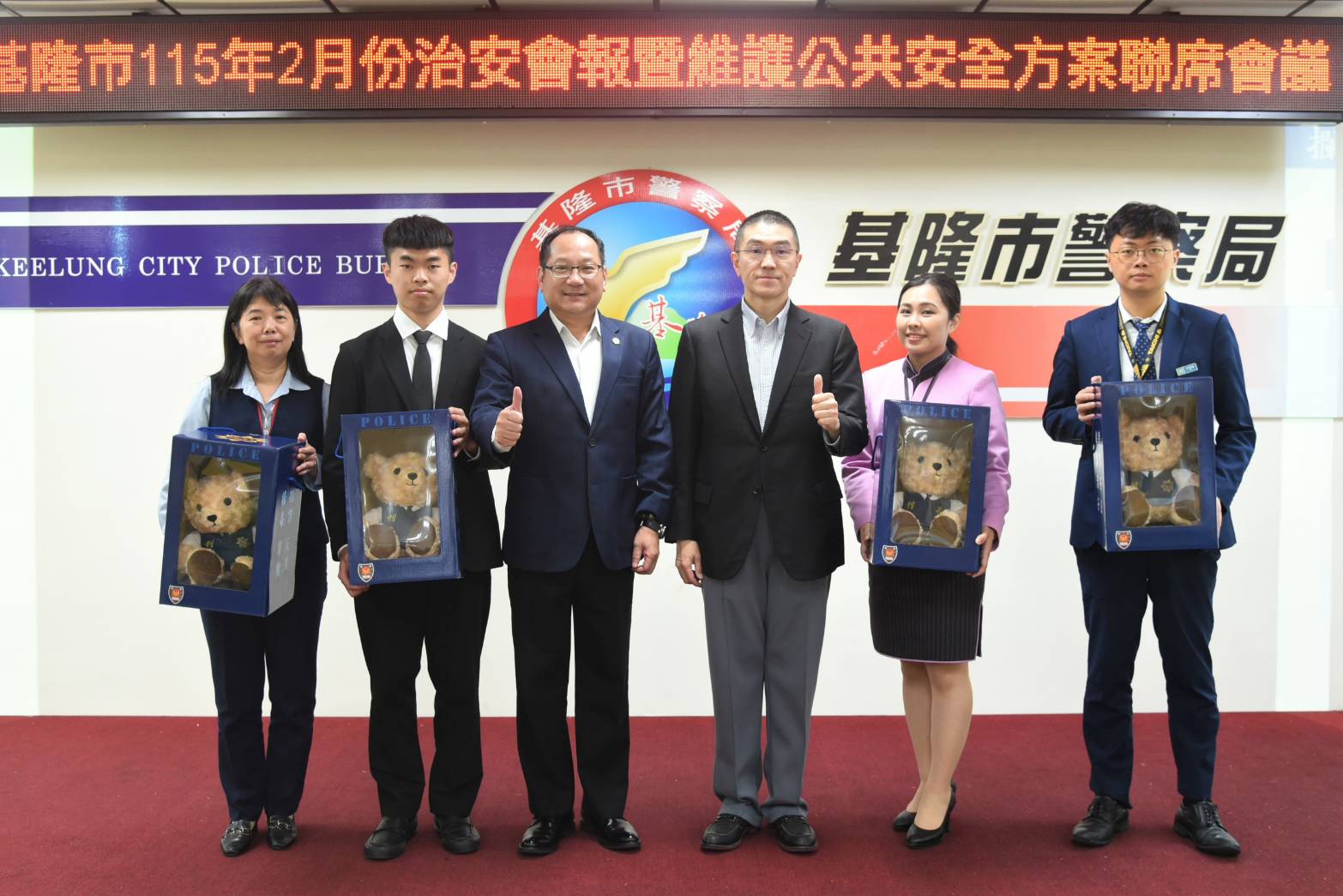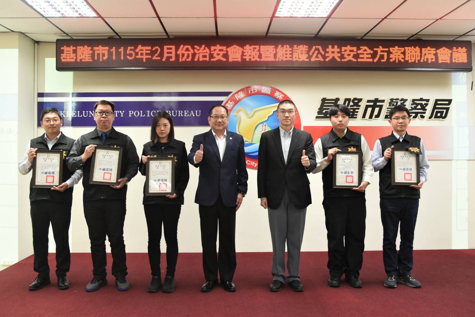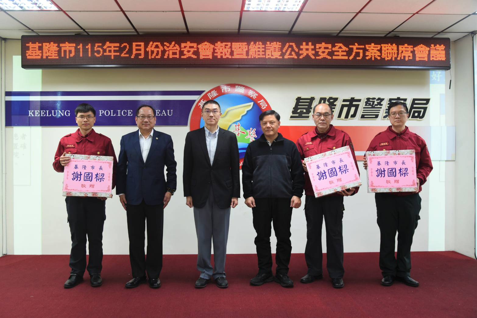 【記者 彭可可/綜合報導】基隆市115年2月份治安會報暨維護公共安全方案聯席會報,於2月26日15時召開,由市長謝國樑主持會議,會中頒獎表揚偵破重大刑案及好人好事優良事蹟之警、消同仁,並頒獎表揚基隆市永豐商業銀行基隆分行、中國信託商業銀行基隆分行、台北富邦商業銀行基隆分行等打詐基隆隊的優秀成員。