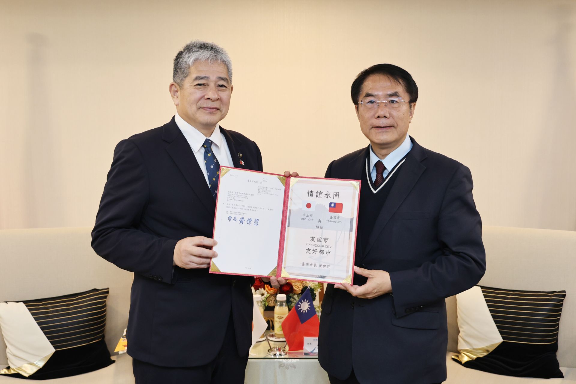 黃偉哲市長頒贈「宇土路」道路命名公文給元松茂樹市長