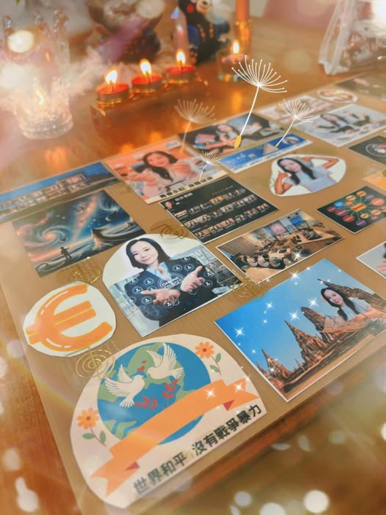 桌上鋪滿彩色的紙張、相片與願望字句,每一張拼貼都像一個小宇宙。