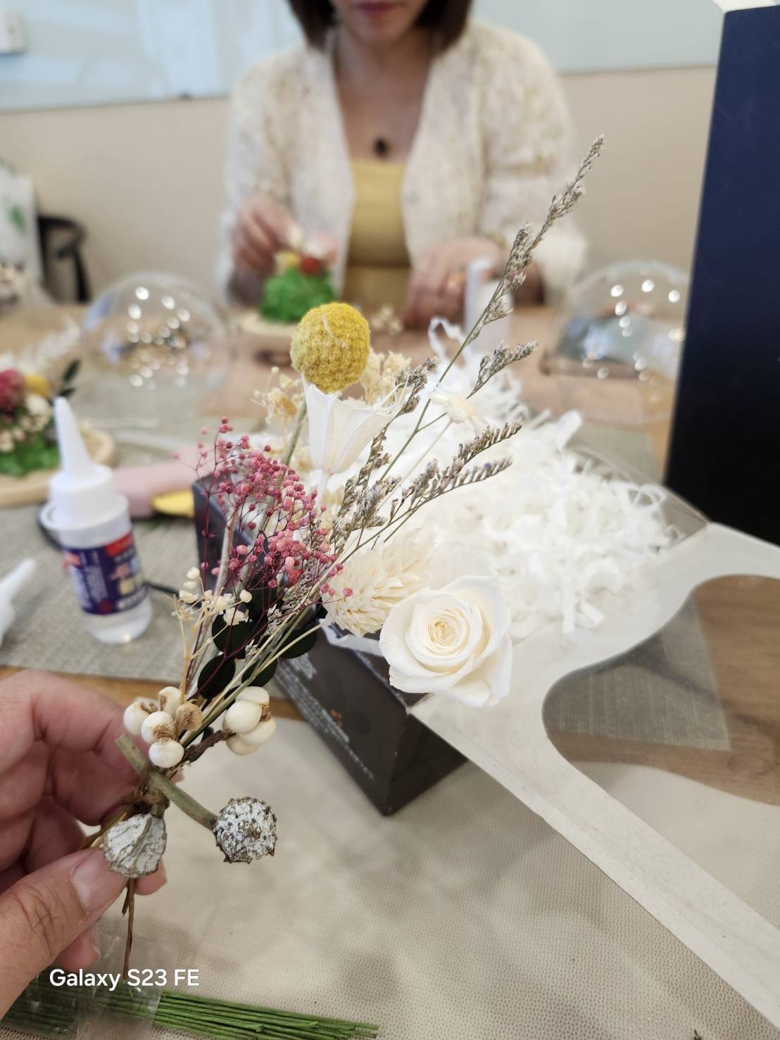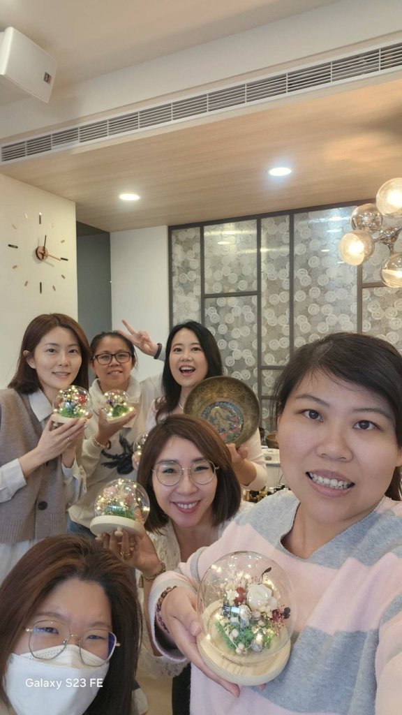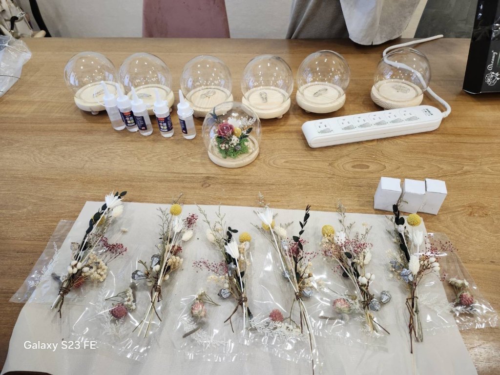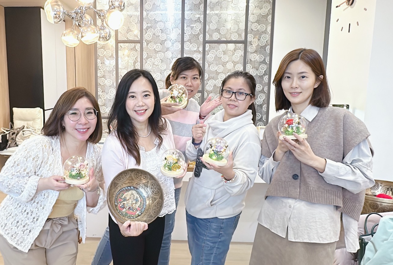 講師示範永生花的配色技巧與燈球組裝方式,學員們一邊創作、一邊交流想法。