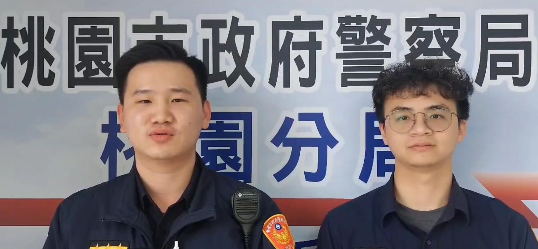 桃園分局小檜溪派出所警員曾紹峻(左)與許修豪(右)主動投入浮洲橋電動車火警滅火。翻攝畫面