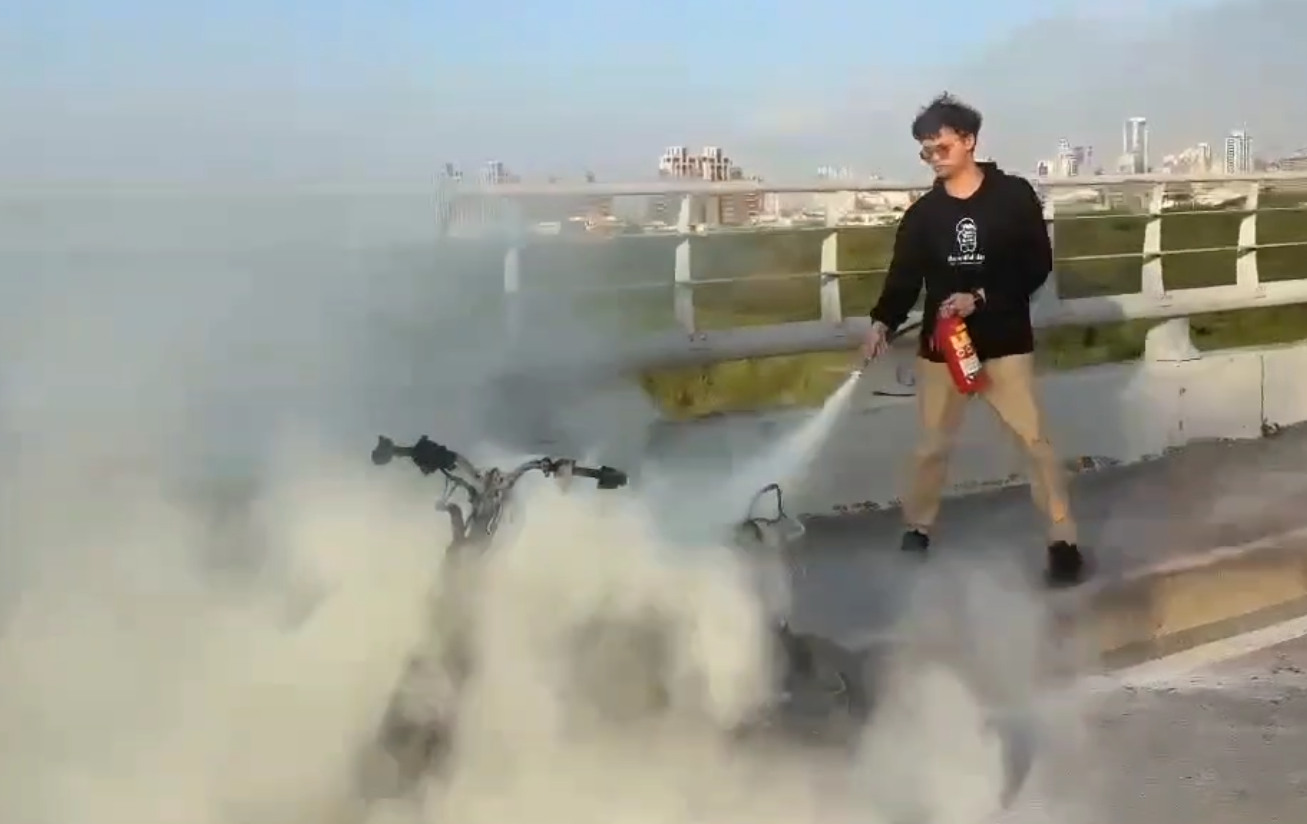 昨(4)日16時29分許,桃園警察分局小檜溪派出所警員曾紹峻與許修豪因公務前往新北市土城區,於回程行經浮洲橋時,發現外側機車道有輛電動機車疑似發生事故起火燃燒,熱心民眾使用滅火器意圖撲滅,但火勢仍持續擴大。