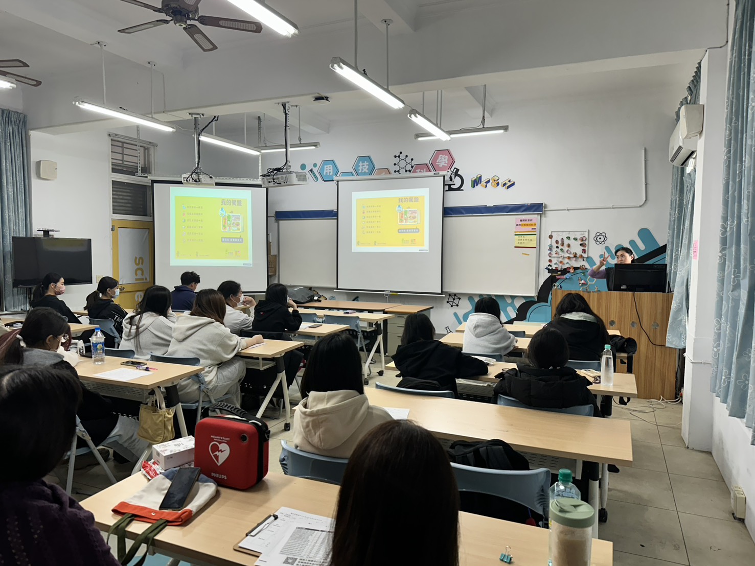 講座中指出,許多學生習慣熬夜追劇、手搖飲不離手、下課久坐不動,這些看似平常的習慣,其實正在消耗身體的「效能」。講師透過生動的「快速自我掃描」,讓學生檢視自己是否中了「一週喝3次以上含糖飲」、「晚上12點後才睡」或「一天坐超過6小時」等風險指標,學子們非常有感。