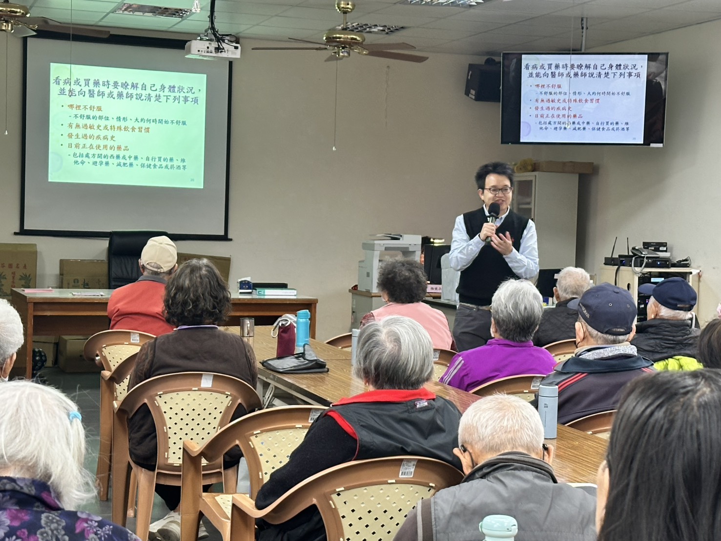 此外,關懷長者的健康促進講座,則與頭屋衛生所及頭屋鄉曲洞村社區發展協會合作,鎖定社區長者關心的「正確用藥」議題 。針對銀髮族常見的慢性病用藥與保健食品混用問題,由林彥彰藥師以淺顯易懂的方式,宣導「正確用藥五大核心能力」。
