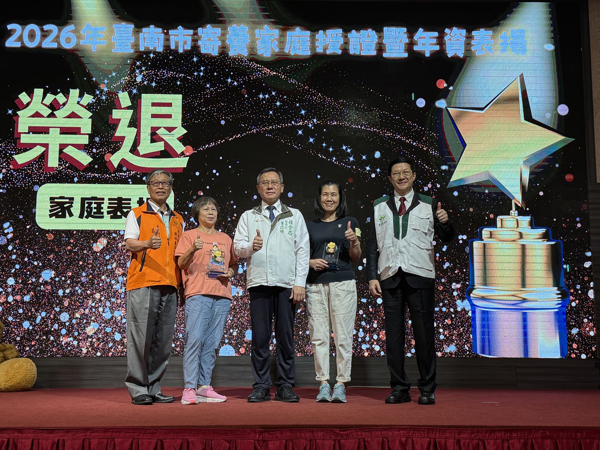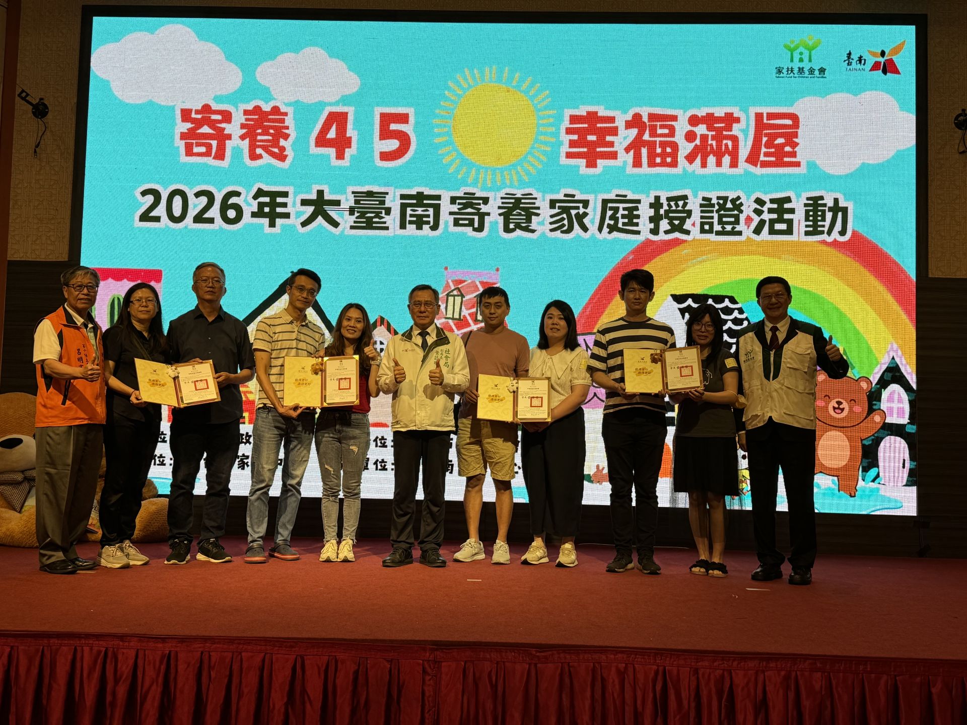 臺南市政府社會局為感謝寄養家庭對於寄養兒少的照顧,今(18)日與北、南台南家扶中心舉辦「『寄養45幸福滿屋』2026年臺南市寄養家庭授證活動」,由社會局葉誌明副局長代表黃偉哲市長頒發81戶寄養家庭合格證書,並分別表揚屆滿服務30年、20年、15年、10年、5年的寄養家庭共計14戶,肯定其長期對寄養兒少的付出,與市府一同守護兒少未來。