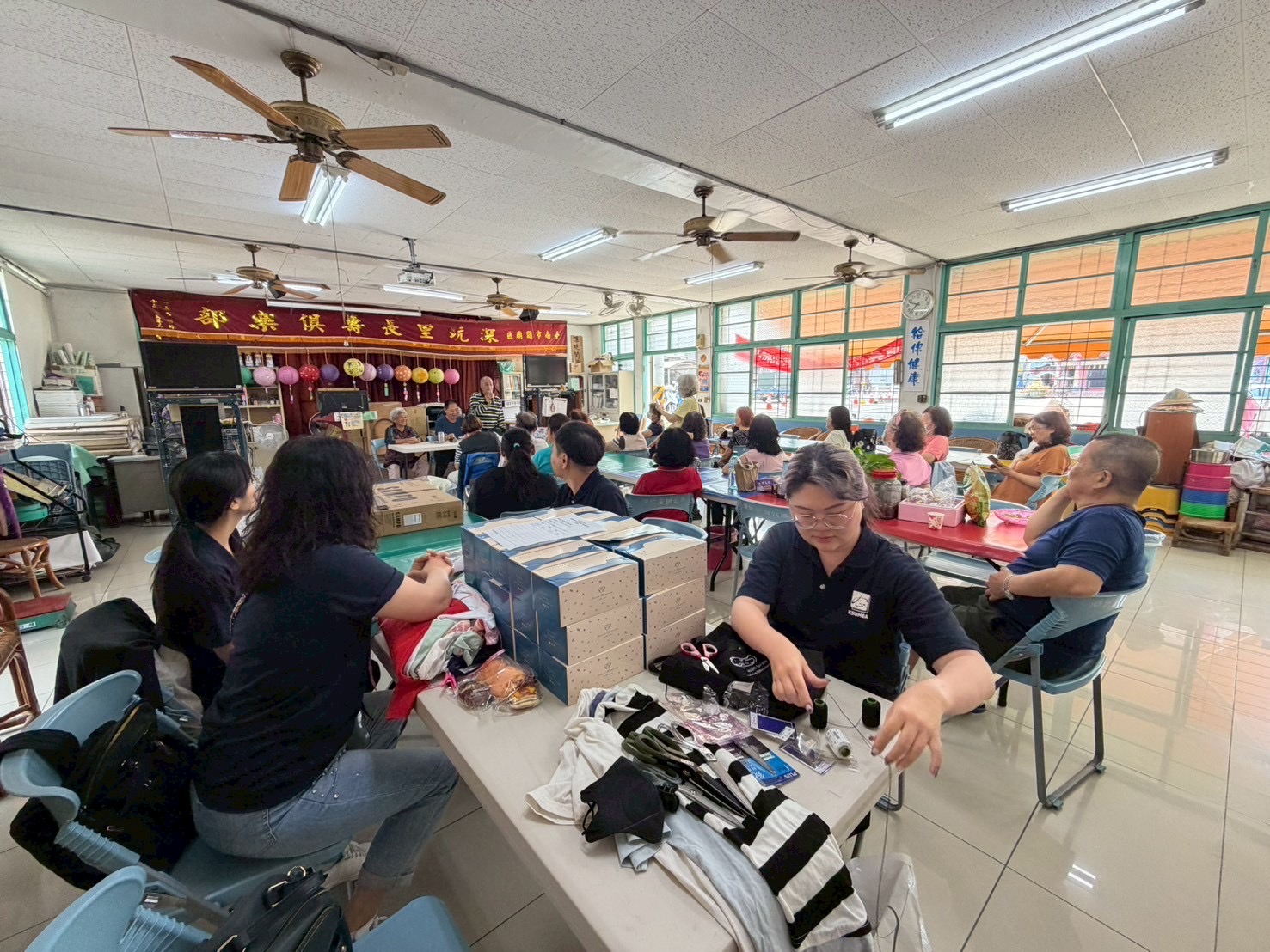 ▲崑大企管碩專班帶領居民將閒置舊衣,華麗變身為實用的環保購物袋。(圖/崑山科大提供)
